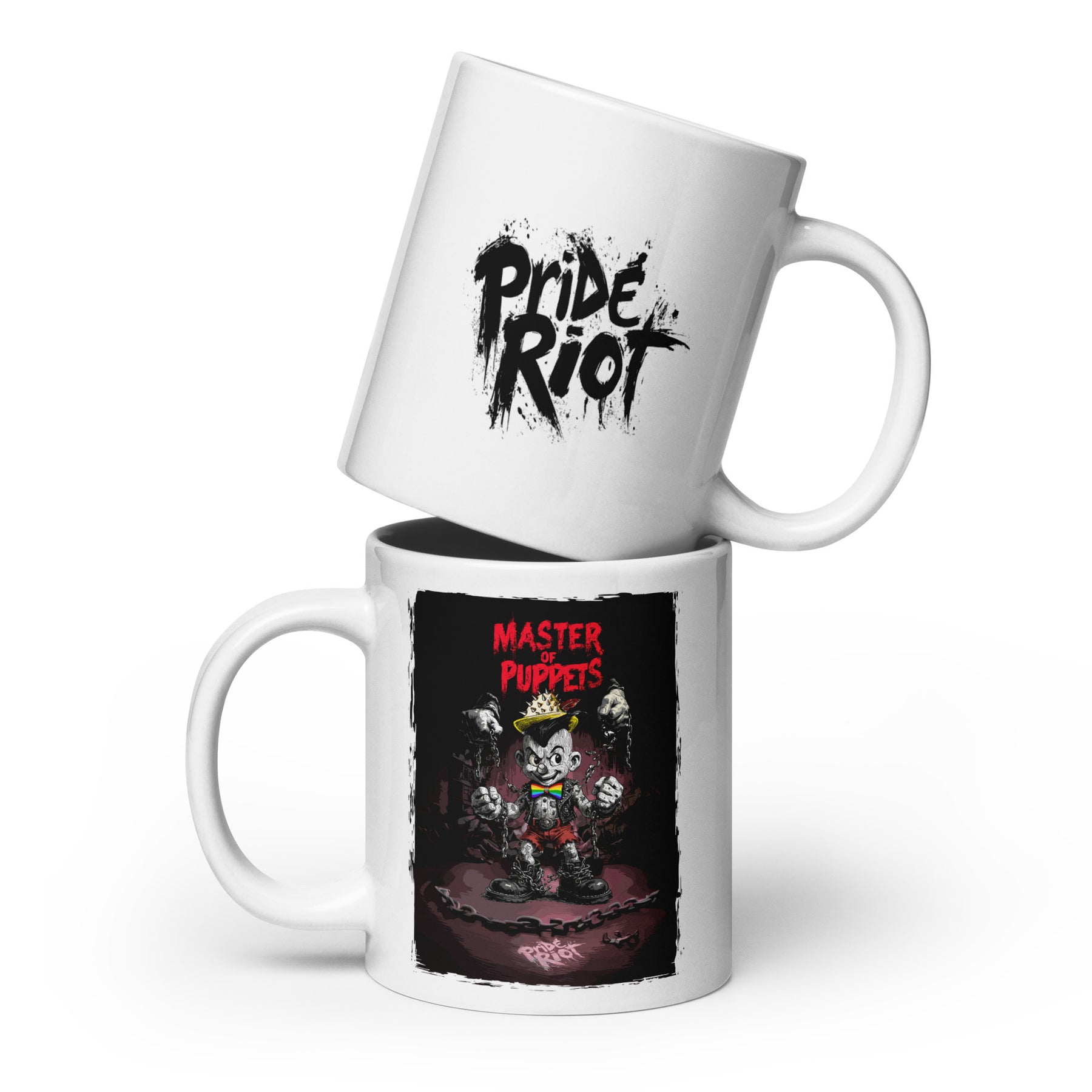Whether it's coffee, tea, or a steaming cup of righteous fury—this Master of Puppets mug is here to serve it hot. Featuring our iconic rainbow-bowtie rebel breaking the puppet strings on one side, and the bold Pride Riot logo on the other, it’s built for both daily rituals and daily resistance.