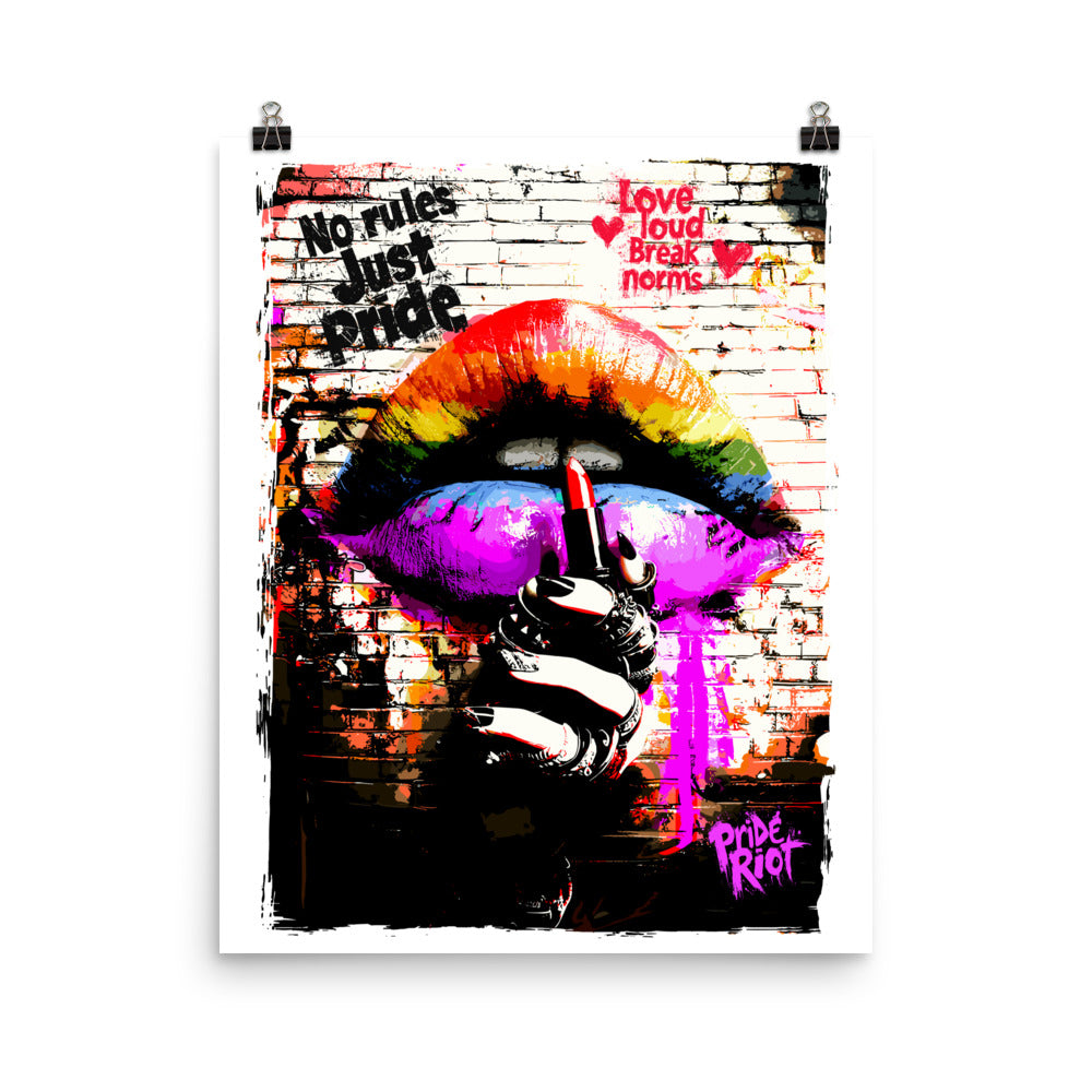 The No Rules Just Pride poster isn’t just wall art—it’s a war cry in matte paper. Featuring a fierce rainbow lip graphic, a defiant lipstick moment, and punk graffiti that says "No Rules. Just Pride," this piece brings unapologetic queer energy to any room.