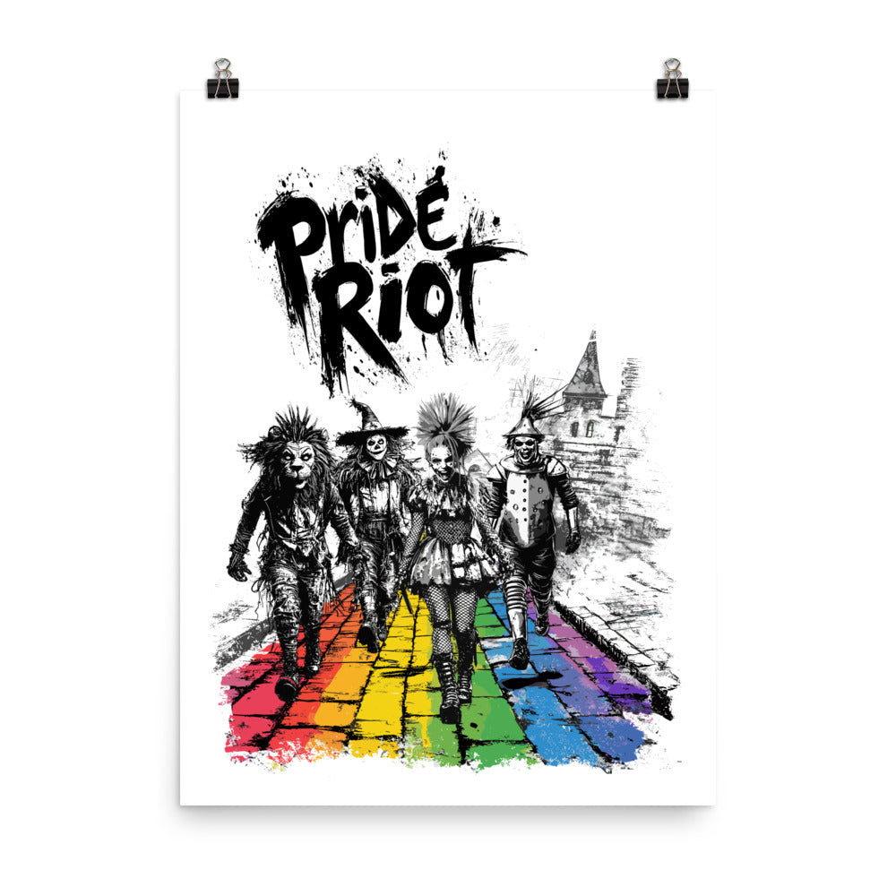 This Wizard of Oz–inspired Pride Riot poster reimagines Dorothy and crew as queer punk icons on the run down a rainbow road to chaos.