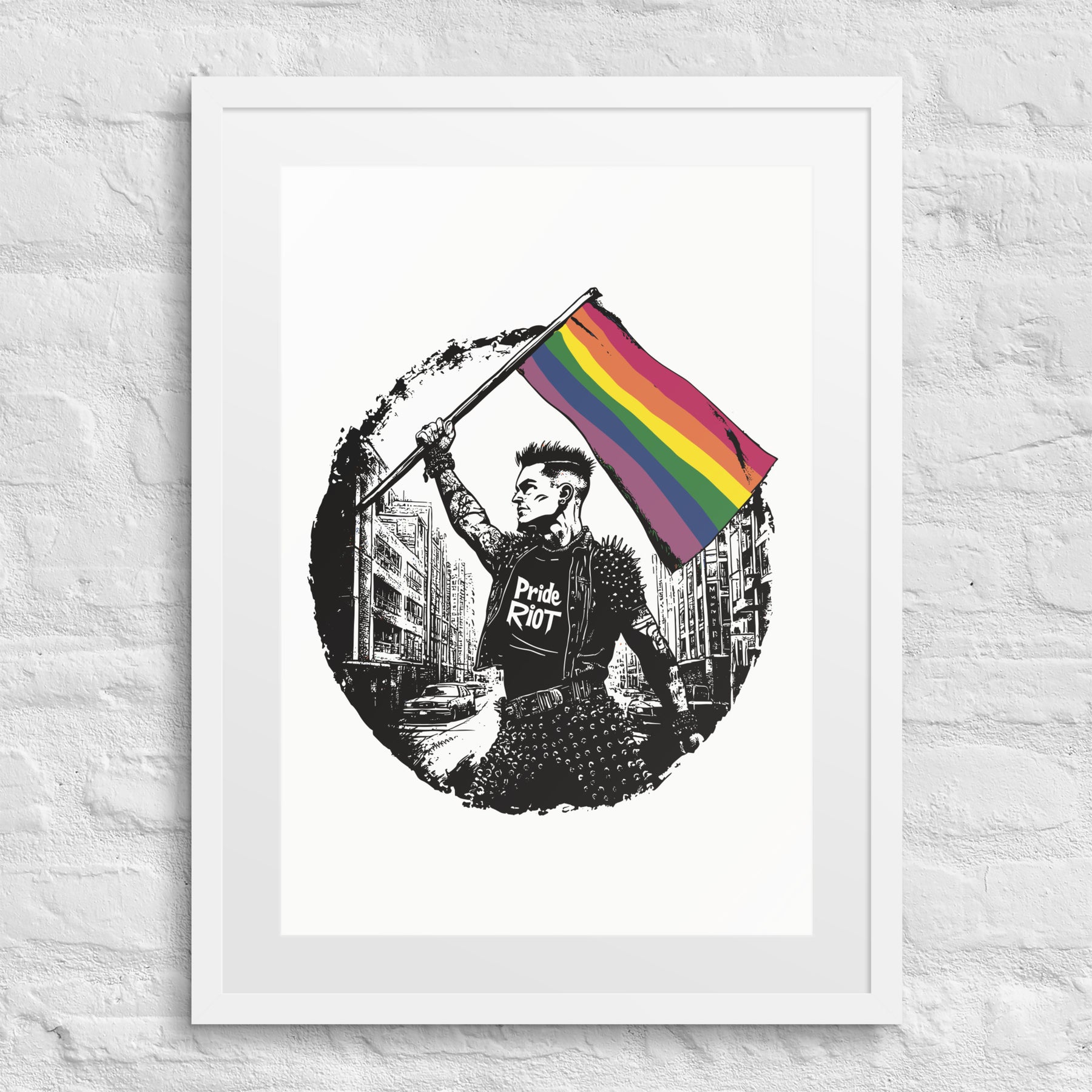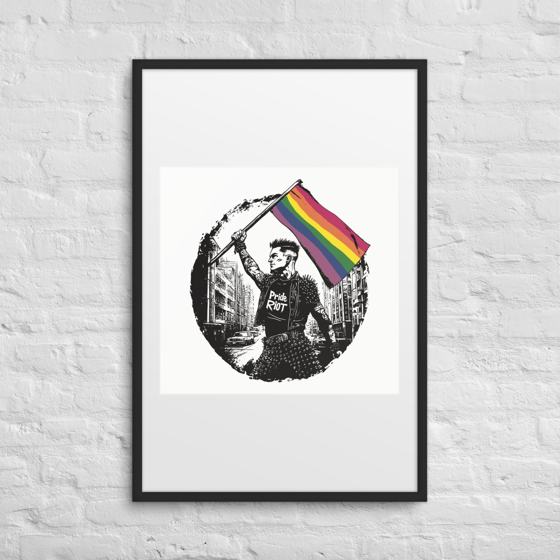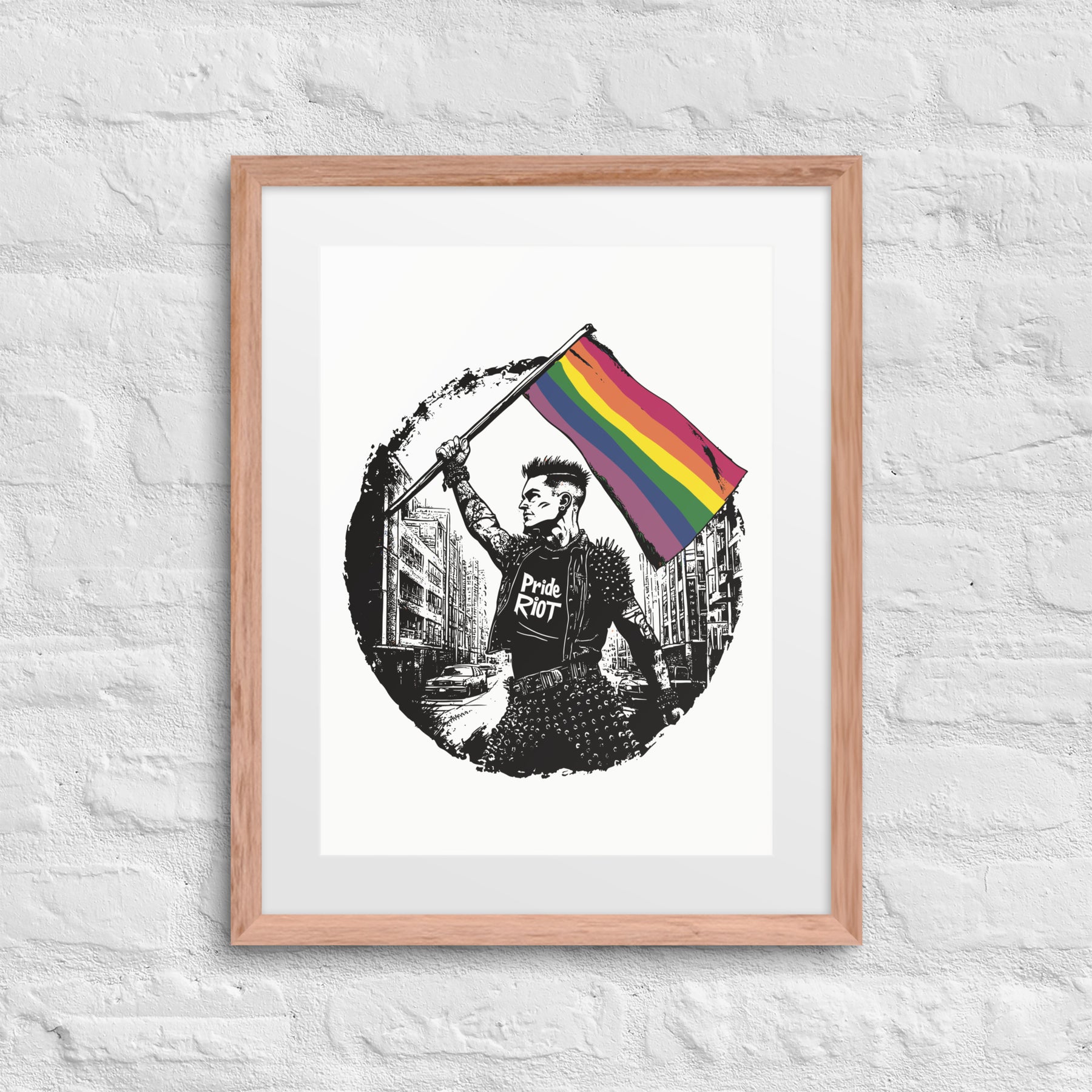 This premium Flagbearer framed poster comes with a white matboard, making your queer rebellion even more striking. Featuring our punk protester proudly raising the rainbow flag in defiance, this piece brings fierce energy and elevated style to any space.