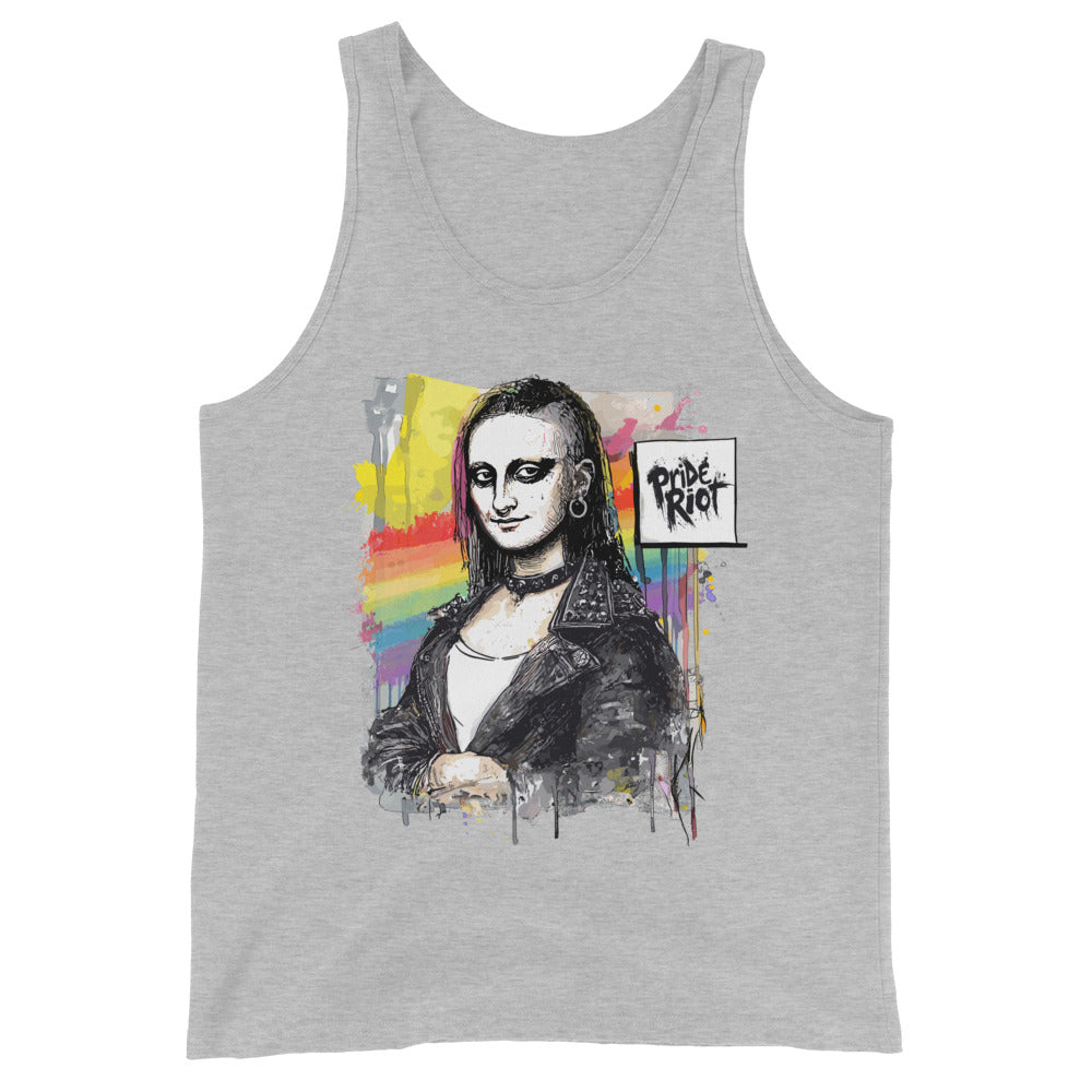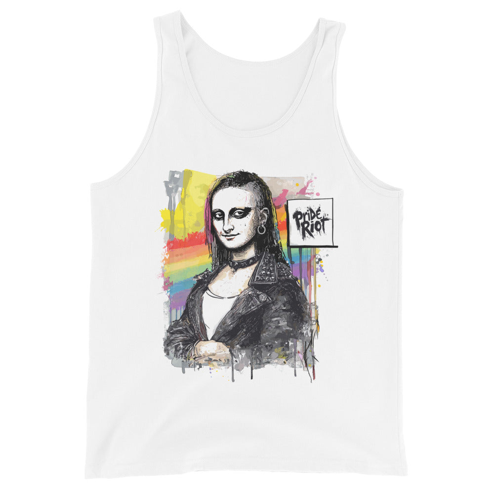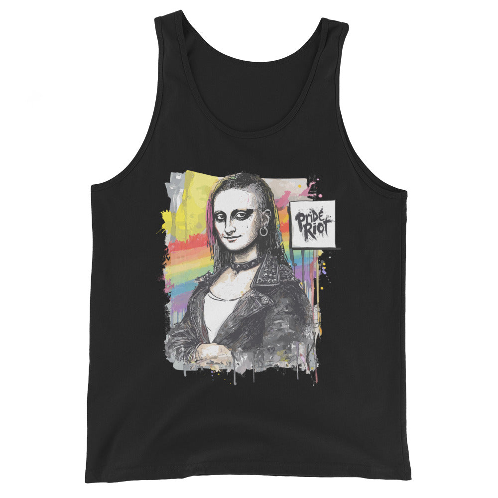 Model wearing a black unisex tank top in a high-energy setting. The shirt features a punk-rock remix of the Mona Lisa. The look suggests queer nightlife or summer festival style.