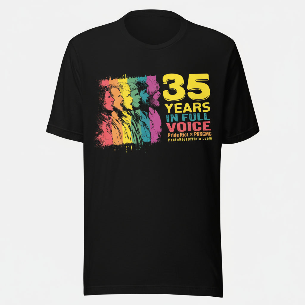 Black and white PHXGMC x Pride Riot t-shirt featuring colorful chorus silhouettes and text ‘35 Years in Full Voice.